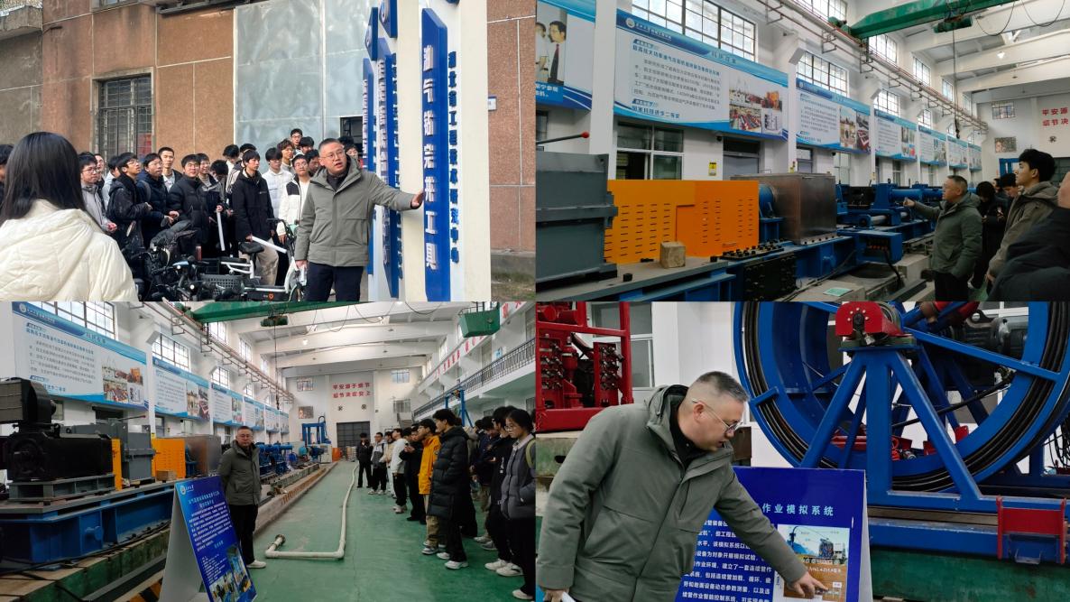 移步CAD井下工具实验室,付必伟老师从实验室的“三大名片”切入,引领同学们走进核心实验平台。付老师详细讲解了油气装备的工作原理与用途,展示了钻具和地下连续管的数代更迭历程,并介绍了学院的发展历史、科研成果及学科特色。