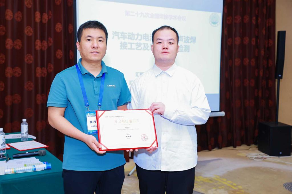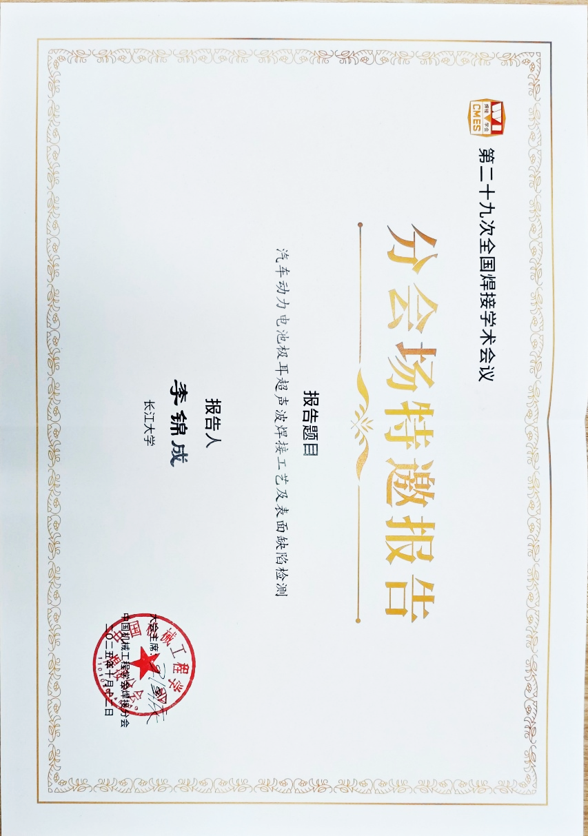 本次会议策划了14个分会场,围绕领域内的前沿科学问题、工程技术难题展开深入研讨,共交流报告近430篇,汇聚了全国焊接科技工作者的创新智慧与最新科研成果。其中,我院2024级硕士研究生李锦成在压力容器、锅炉和管道焊接分会场作了题为“汽车动力电池极耳超声波焊接工艺及表面缺陷监测”的特邀报告,与在场专家就动力电池焊接技术、机器视觉及焊接裂纹检测算法进行了深入交流。