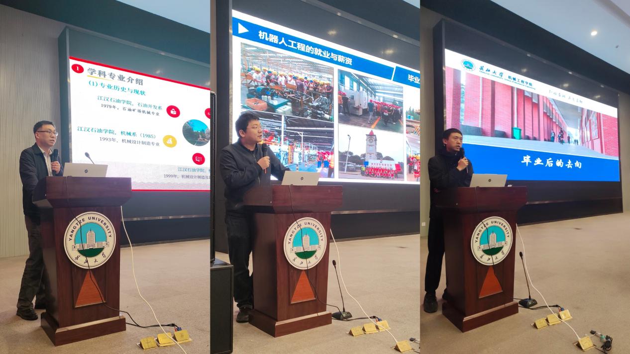 在专业宣讲环节,各专业方向负责人代表依次登台。李宁老师首先围绕机械设计制造及其自动化专业进行了详尽介绍,并重点解读了卓越工程师班的培养模式,突出了其在产业实习与课程安排上的独特优势与核心竞争力;紧接着,施雷老师对机器人工程专业进行了系统宣讲,不仅剖析了其学科交叉特点与未来趋势,更邀请了机器人竞赛团队进行现场对打演示,让同学们直观感受了智能控制与人机交互的技术魅力;最后,黄文浪老师对材料成型及控制工程专业进行了全面宣讲,从学科历史、产学研特色到实习就业去向,深入解读了该专业在先进制造与新材料应用领域的广阔前景。